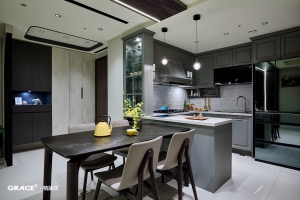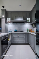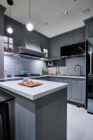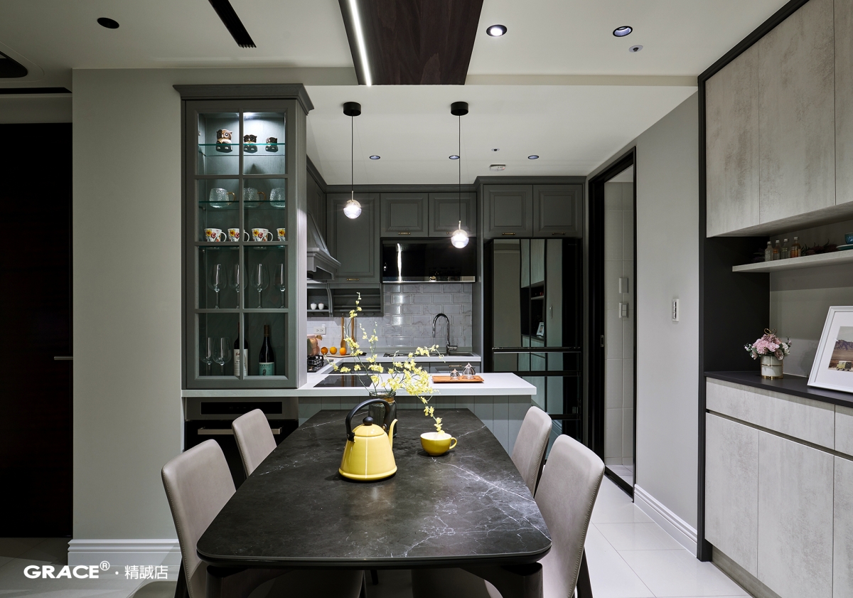 像是賦予櫥櫃一層朦朧的光,高檔大氣,壁面的磁磚搭配上溫潤如玉般材質,靜謐而美好。