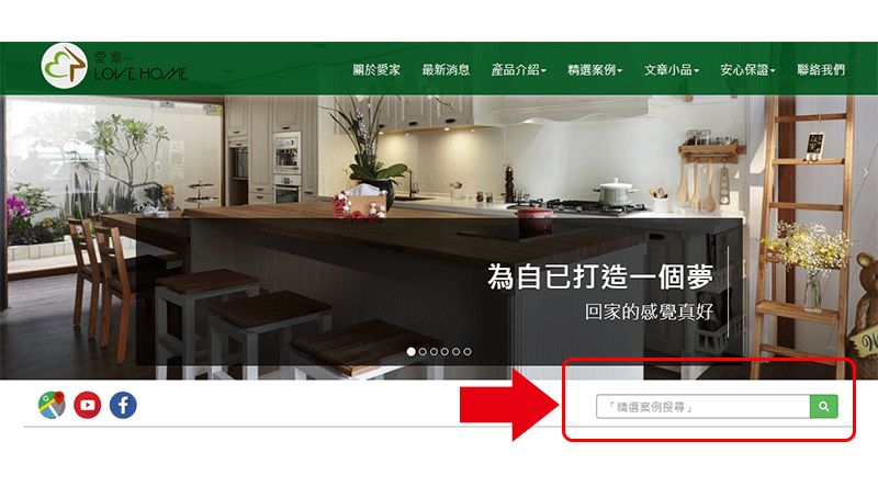 網站的左上角有一個「精選案例搜尋的」輸入框,您只有將風格類,例:鄉村實木、現代混搭…等或規劃類,例:廚具、櫥櫃…等相關字填入並按下搜尋,將會快速將所有相關的案例,以條例式的方式呈現,您即可去感受體驗成品的風格。